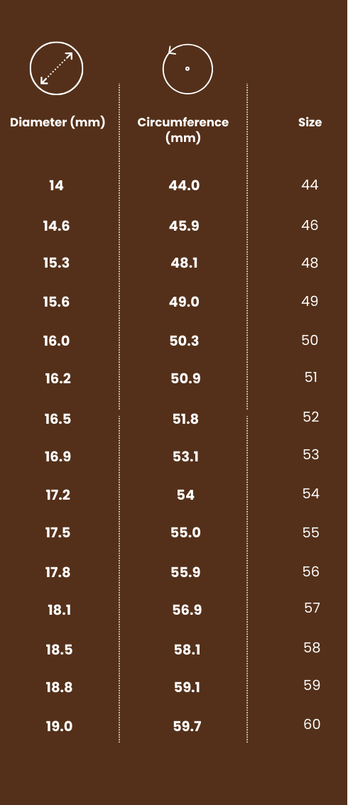 - Measure the inside diameter in millimeters (mm) — edge to edge, without including the thickness of the ring.